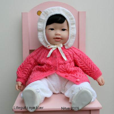 Strikket i garnet Pt 5 på p nr 2,5 i ubleket hvit og rød. 50gr av hver farge.